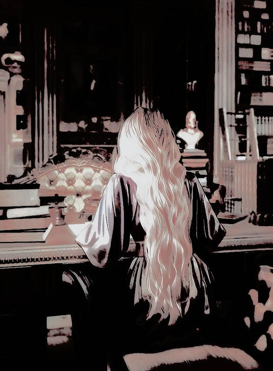 Rosalyn is a slim young woman and she has long, white hair that curls at the ends. Her azure spheres shone brightly, reflecting the frostiness of the winter. Beautiful eyelashes rimmed her eyes, making them stand out so much more. The white creamy tone of her skin reminding as moonlight, just like her strands of hair. She usually wears a dress, mixed with the slight hues of white or red nebula as if galaxies were being born in her bodice or sometimes a simple design in the realm. Rosalyn is always pictured as a strikingly beautiful woman as if moonlight comes, this reflected light, to warm the orbs until dawn.